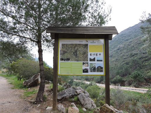 Frente al centro hay una pequeña área recreativa y una roca habilitada a modo de pequeño mirador. No faltan los paneles explicativos sobre el centro, el entorno y la ruta en este punto inicial en el que comenzaremos a andar por un camino asfaltado que formaba parte de un proyecto de urbanización que no se llevó a cabo. Nada más comenzar a caminar, pasada la primera curva pronunciada, nos encontraremos el primer cruce de caminos. Haremos caso a la señalización vertical y continuaremos recto, aunque si girásemos a la derecha tampoco pasaría nada porque poco más adelante se vuelve a enlazar con la ruta. En el siguiente cruce sí giraremos hacia la derecha e iremos fijándonos en las señalizaciones que nos irán aproximando, con ligero descenso, al barranco de la Caldereta.